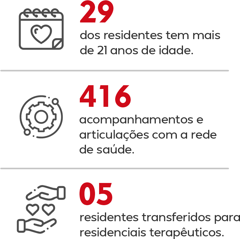 Este projeto oferta o serviço de acolhimento institucional para jovens e adultos com deficiência intelectual, em situação de dependência, que não disponham de condições de autossustentabilidade ou de retaguarda familiar. Caracteriza-se por oferecer proteção integral por tempo indeterminado visando garantir cidadania, saúde, segurança e projeto de vida.